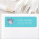 Adressetikett för återvändande för utfall med en illustration av en haj med ett leende och en party-hatt på blå bakgrund. Perfekt för en födelsedagsfest med hajtemat.