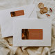 Den lämnat kant i eleganten med den moderna returadressetiketten för bröllopsinbjudan innehåller en bränd orange vattenfärgsagat gräns som trimmas med faux guld glitter. Med anpassadet kombineras handskrift och typsnitt av blek guld-färgad på en brinnande orange.