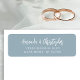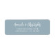 Den här enkla, moderna returadressetiketten för bröllop innehåller parets namn i ett vitt skript för snyggt, med två linjer för adress nedan i vitt sans serif-teckensnitt på en dammig blå bakgrund.