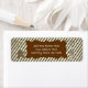 Blåa och bruna diagonala returetiketter med två träd-dekorationer, en brun banderoll där du kan lägga till ditt namn och adress och en bakgrund av blått och brunt diagonalt rand.