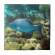Simma ovanför mjuka koraller, revar fjällen av en blått fisken väljer upp några glints av solen, som det ljust filtrerar besegrar från ovanför vatten yta, stund annan mindre fisksimma i bakgrunden.
