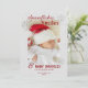 En modern, söt bebisannonsering högtidskortsmall med vintertema, med en vit krossad folie bakgrund (digital effekt, inte riktig folie!), snöflingor med en rhinestone-effekt och modern, julröd kalligrafi och typografi för titeln: "Snöflingor, Leenden & Bebis Kramar".