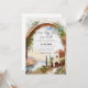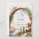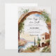 Denna bröllopsinbjudan visar en grekisk landskapsbild av en struktur byggd på en klippa med utsikt över Medelhavet nära solnedgången.