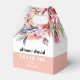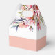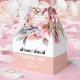 This wedding favor box displays a beautiful rhododendron branch adorned with delicate peach-pink flowers and sage green greenery. The couple's names are elegantly displayed in bold typography, adding a personal touch to the design. A heartfelt 'Thank You' message is also included, expressing gratitude to the guests. Completing the look, a stylish peach-pink band adds a touch of sophistication at the bottom of the box.