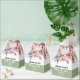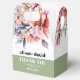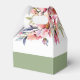 This wedding favor box displays a beautiful rhododendron branch adorned with delicate peach-pink flowers and greenery. The couple's names are elegantly displayed in bold typography, adding a personal touch to the design. A heartfelt 'Thank You' message is also included, expressing gratitude to the guests. Completing the look, a stylish sage green band adds a touch of sophistication at the bottom of the box.