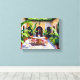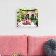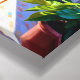 En texturerad målande bild av ett marockanskt trädgårdsgård i stil, med mosaikplattor, lush greenery och vibrerande ljus och skugga.