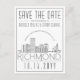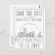 Ett unikt bröllopskort för att meddela kommande bröllop i den vackra staden Richmond, Virginia. Denna inbjudan har en stiliserad illustration av Richmonds unika siluett med stadens namn undertill. Detta följs av information om er bröllopsdag i en matchande öppen linje-stil. På baksidan av kortet finns er adressinformation. Alla delar av inbjudningskortet är upplåsta så att ni kan ändra alla detaljer ni vill, som t.ex. teckenstorlek, stilar med mera genom att använda funktionen för anpassning. Ni kan lägga till ett foto på baksidan och lägga till ett svart-vitt filter på det. Ha kul och var kreativa och gör det till ert eget!