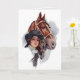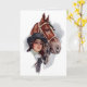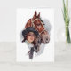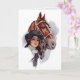 Rid- bild för vintage med den unga kvinnan i svart hattinnehav tygeln av henne häst. Konst vid Harrison Fisher, och försiktigt retuscherat till återställandefärg och specificerar.