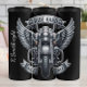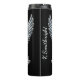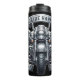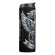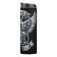 Bilden innehåller en detaljerad, metallisk illustration av motorcykelns framsida, uppbyggd av ett stort, svåröverskådligt designat vingar. Banderoller ovanför och under motorcykelns visning: "RIDE HARD" och "RIDE FREE". Med monokromatiska silver- och grått-tonerna ge är teckningen en klassisk symbol eller ett utmärkande utseende.