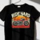 Här är en annan trending vintage-stil t-shirt design med återsolnedgångslandskap med solnedgång och frasen "RIDE HARD". Säg till om du vill ha några förändringar! ✨