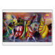 Elegant, vismisk, konstnärlig målning med magisk, färgstark musikinställning, måne, älvor, hästar med pulserande blå grönt, röd,gult,vit färg .Akrylmålning på arbetsyta, blandmediamålning med golden och silver folie.