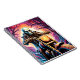 ett skelett som har fastnat i pandemoniumcykeln. Han har en svart läderbyxor och motorcykelstövlar och ett svart läder jacka med ben som formar sig på bilkerutrustningen. sol går ner bakom honom. Dimma stigning upp från hans omgivning till mörkens natt han rider iväg med nattstjärnor ovanför.
