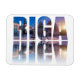 Riga-text som består av ett foto av berömd House of the Blackheads and Rolands Statue på svart bakgrund med textreflektion i vatten. Solnedgång täckt av snö Riga Town Hall Square på vintern, Lettland