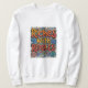 En levande design innehåller frasen "Riker med radisor" i ett lekfullt, rundat teckensnitt. Texten omges av en färglös matris av geometriska former och symboler för abstrakten, som ordnas i ett symmetriskt mönster. Den övergripande designen är djärv och öga fångande.