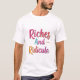 T-shirt-designen innehåller texten "Riker och Ridicule" skriven i ett ljust teckensnitt med flera färgader, som påminner om gatukonst. Texten är centrerad på skjortan och omgiven av en mängd färgformer och mönster. Den totala effekten är att öga fångar upp och spelar.