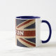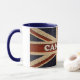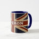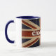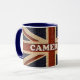 Mugg för riksdagsval för U.K. för Cameron ~ politisk. Retro facklig jackflagga med förse med text: Cameron i mittet av flagga.