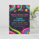 En livlig och lekfull födelsedagsinbjudan med en psykedelisk, retroinspirerad design. Den mörka bakgrunden är dekorerad med färgglada, virvlande former, abstrakta linjer och livfulla färgdropar som påminner om 1970-talet. Kanten är ett roligt mönster av flerfärgade glada ansikten, med stjärnor och bubblor utspridda i designen. Texten är i en blandning av feta och lekfulla teckensnitt, med viktiga detaljer markerade i ljust blått och rosa.