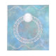 En ornerad, stiliserad silver-filigree ring studerade med grumligt vita pärlor och med en enda runda vit gem med en stjärna som glanserar från dess djup, mot en bakgrund av vattentäta blå fraktioner.