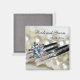 Anpassa elegant Ringar och Vita Pearls Bröllop Square Magnet med det personliga namnen av briden och brudgummen och giftermål-ceremonin för att skapa en av en sorts partyst eller spara datum meddelande. Den här personligt bröllp-magneten i klass har ett nära foto av ett diamantband förlovning ring och bröllop med ett vitt pärlhalsband.