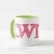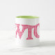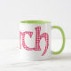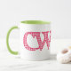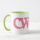 En roligt Ringer Mugg med ett Grönt läpps- och handtag och den walesiska ord 'cwtch', som betyder 'cuddle' eller 'hug', i ett keltiskt skript, fylld med en klarröd och vit Check Gingham mönster.