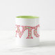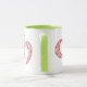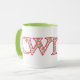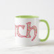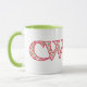En rolig Ringermugg med en grönt kant och handtag och det walesiska ord "cwtch", menande "omfamning" eller "kram", i en Celtic skrivar, fyllt med en nätt röd, grön och vitblommönster.