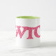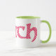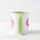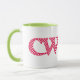 En rolig Ringermugg med en grönt kant och handtag och det walesiska ord "cwtch", menande "omfamning" eller "kram", i en Celtic skrivar, fyllt med ett ljust rött, och vitpolkaen pricker mönster.
