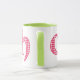 En rolig Ringermugg med en grönt kant och handtag och det walesiska ord "cwtch", menande "omfamning" eller "kram", i en Celtic skrivar, fyllt med ett ljust röd och för vitkontrollGingham mönster.