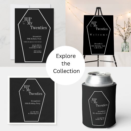 Det här är en modern, 20-talets RIP-design, god 30års födelsedag party. Den här enkla RIP-designen på 20-talet är i klassiskt svartvitt med snyggt- och kista-/korgform. Mallen är inställd så att du bara kan lägga till information om födelsedagsfesten. Perfekt för en coola och roligt, 20-talets gothic, themed, 30års födelsedag party. Om du vill anpassa kan du bara använda den här kommandoknappen för att lägga till namn och party-detaljer. Här kan du också ändra ålder eller resten av texten om du vill. Om du vill ändra färg eller teckensnitt markerar du verktyg som redigerar designen. Om du behöver hjälp med att anpassa, matcha produkter eller ett anpassad design kontaktar du mig via zazzle-chatta.