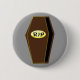 Den här knappen har en läskkista som är gjord av trä med guld. Kassan är lätt öppen och avslöjar bara mörker inom. Plakan i guld längst fram i kistan har en svartvit text på den som säger RIP, ge ingen aning om vem eller vad som kan luras inuti. Den här roligten är ännu en dyster kista perfekt för Halloween. Bakgrunden till det dystra gråttet är att dra observatörens öga mot domedagskassan.