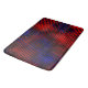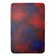 Riscos vermelhos com tons mais claros e escuros que foram kryssados e passados em filtro que os modificou de maneira que não se percebe mais riscos, mas, parecem formas quase quadradas sobre um fundo azul, podendo causar a konstatção de profundidade no azul.