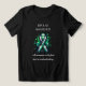 T-shirt to help spread awareness for Bipolar Disorder with a black, white and green striped awareness ribbon. An inspirational quote with the words, "Rising through the highs and lows." and "Awareness is the first step to understanding."