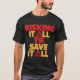 Den svarta t-tröjan innehåller texten "RISKING IT ALL" överst i ett fet rött teckensnitt. Under skiktas "TO" ovanför en hjärtform, båda i rött. Uttrycket "SPARA IT ALL" finns på grund i ett fet gult-teckensnitt. Stiliserad flamgrafik ingår i ord "IT" i både översta och grund. Den här utformningen hedrar brandmännens mod och hängivenhet.