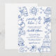 Något Blått Innan Jag Gör Bröllopsdusch-inbjudan. Denna eleganta och lekfulla design har blå typsnitt och illustrationer, perfekt för att fira den blivande bruden med ett "något blått" tema. Överst visas "Något Blått Innan Jag Gör" i en blandning av elegant skrivstil och klassiska serif-typsnitt, vilket ger en stilren och minnesvärd ton.