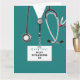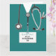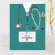 Kreativ sjuksköterskeutbildning examens kort med sjukhus dräkt, stetoskop och rolig schweizisk armé kniv. För att anpassa redigera text för att lägga till sjuksköterskans namn.