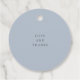 Dessa vackra märkre med bröllopsförmån för blommigten har en vattenfärgad bukett av dammig färgad ro och blommor i persikor, rosa, blått och grönt, med elegantens moderna text som säger "tack". Baksidan av märkrn är ljusdammig blå.