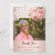 Ett modernt Tack-fotokort. En övertoningsbakgrund i ro guld som är dekorerad med rosa ros, blommor och snöre. Anpassa och lägg till fotot på framsidan och tackkort på baksidan.