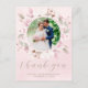 Tack till dina gäster i bröllop i stil med anpassningsbarna för blommigt i elegant tack vare det platta vykortet. Den här designmallen innehåller bild på framsidan med en blommigt av handmålat rosa ros och grönt på en vattenfärg tvättat bakgrund. Under fotot står "Tack" i modernt skript och under är ditt namn med bröllop-datum att anpassa sig till. Baksidan av vykortet har ett anpassningsbar-meddelande och namnteckning accentuerat av en bukett av ro. Designad av Susan Coffey.