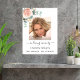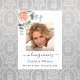 Anpassa och lägg till ett foto, ett namn och data. En vit bakgrund, dekorerad med ro guld och rosa ros, blomma och eukalyptus grey.