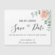 Ett modernt Spara datum magneter-kort för bröllop. En chic vit bakgrund som dekoreras med grönt vattenfärgad eukalyptus grey, löv och sprit och en ro i färgaden ro, blomma, blommigt. Anpassa och lägg till namn, datum och ställe på platsen. Svart färgad brev. Texten: Spara datumet skrivs med ett stort trendig-handskript i stil.