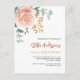 En vit chic bakgrund. Dekorerad med en stor blommigt för guld och rosa, blomma från ro och grönt, vattenfärgad eukalyptus löv, sprig, grönsak och faux ro sprig. Anpassa och lägg till ditt namn och information om party. Bakåt: gröntens bakgrund färg.