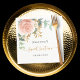 En vit chic bakgrund. Dekorerad med en ro guld och en rosa vattenfärgad blomma, blommigt, grönt eucalyptus löv, spriter, grönsaks- och faux ro sprigs. Anpassa och ett namn och datum. Svarta och guldfärgade brev