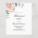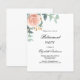 För ett pension party. En vit bakgrund, ro guld färgad ro, blomma och eukalyptus greenergiy. Anpassa och lägg till party-informationen. 1 lakan = 1 inbjudan tryckt kant till kant.