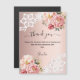 Färggradientbakgrund för ro guld. Dekorerad med rosa ros, blommor och snöre. Stora bokstäver med dekortecken och text: Tack. Anpassa och lägg till tackkort och namn.