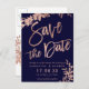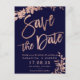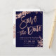 Inbjudan till inbjudan att lämna inbjudningar till ro om typografi i löv blommigt, marin blå chic bröllop spara datum. Skicka datumkortet med den här eleganten faux ro guld typografi med löv blad på marinblå bakgrund, perfekt för chic stil bröllop