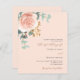 En persiko-färgadens bakgrund. Dekorerad med blommigten ro guld, grönt vattenfärgad eukalyptus löv, sprig, grönsak och faux guld sprig. Anpassa och lägg till information om namn och bröllop. 1 lakan = 1 inbjudan tryckt kant till kant.