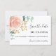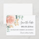 Vit bakgrund med stor ro guld och rosa ros, blomma, guldsprit och eukalyptus greenery. Anpassa och lägg till datum och namn/ålder. Texten: Spara datumet skrivs med ett stort trendig-handskript i stil.