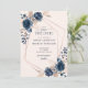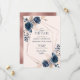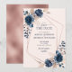 Modern och trendig, denna söt bröllop spara datum-kortsutformning har en geometrisk präglad av marinblått och dammigt rosa rosor och blommor, även med trendtecken på dammig rosa bakgrund. Kortets baksida har ett vackert ro guld struktur. En del av en matchande bröllop-svit. Inbjudningskort för Elegant av upphovsrätt, alla höger reserverade.