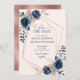 Modern och trendig, denna söt bröllop spara datum-kortsutformning har en geometrisk präglad av marinblått och dammigt rosa rosor och blommor, även med trendtecken på dammig rosa bakgrund. Kortets baksida har ett vackert ro guld struktur. En del av en matchande bröllop-svit. Inbjudningskort för Elegant av upphovsrätt, alla höger reserverade.