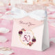 Elegant och glamoröst för 50:e (eller någon ålder) födelsedagspartiet. På framsidan: brev och texten: Tack. Framsida och baksida: En rosa guldövertoningsbakgrund med en geometrisk ram för faux-guld. Dekorerad med mörka lila- och burgundblommor, rosor och boho-stilfjädrar och rosgula faux-glitterdroppar, färgdroppstift. Namn är skrivet med rosa handskript i stil. Datumet skrivs med svarta siffror och är 50 år i burgundi.