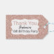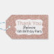 Ro guld glitter födelsedag tack för märkrn. Utformningen har en baksida av ro guld glitter och texten "Tack" i ro guld glitter. Ditt eget namn.
